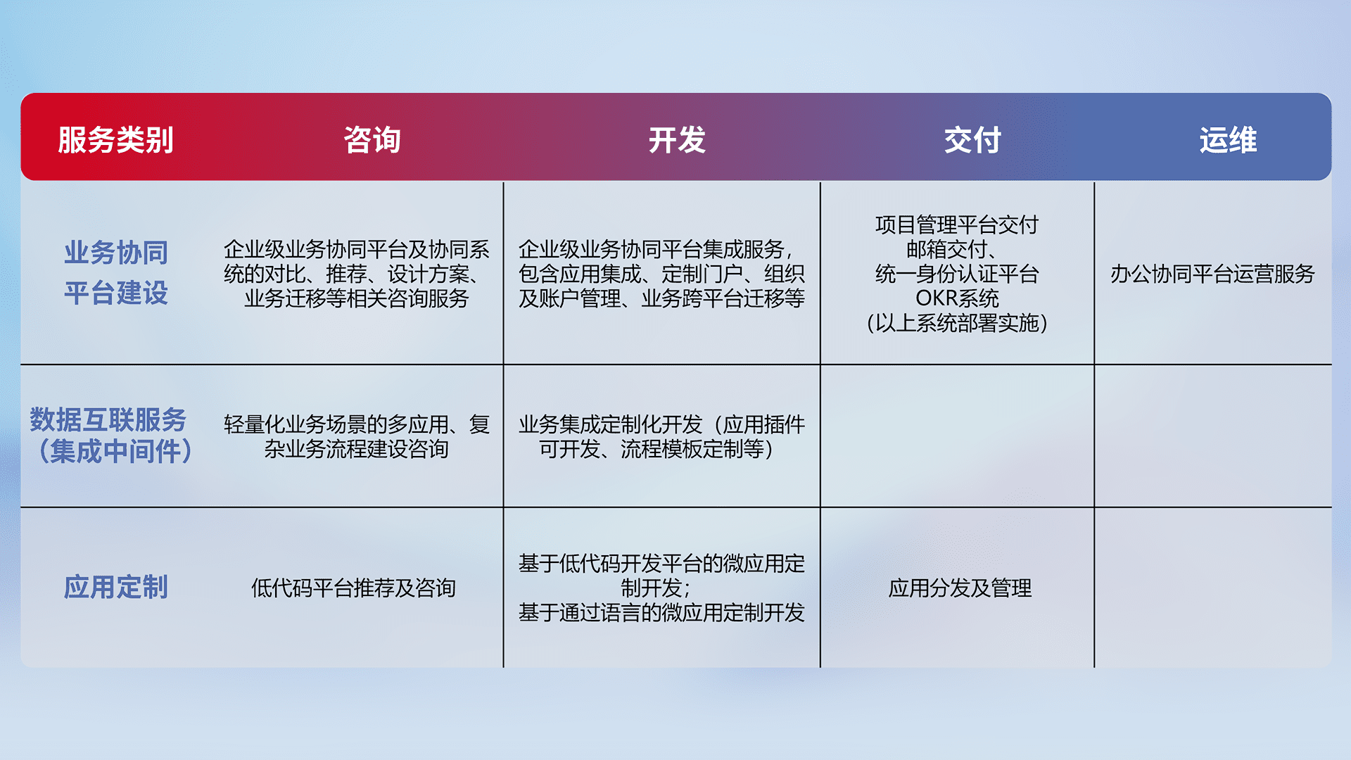 针对钉钉、、企微、、、IDaas等平台级产品提供产品的规划、、方案、、、、交付、、、定制化开发等服务,,实现如统一协同办公、、、智能客户服务、、、混合会议管理、、智能数据查询、、、等业务场景,,,,实现数字化转型。。。