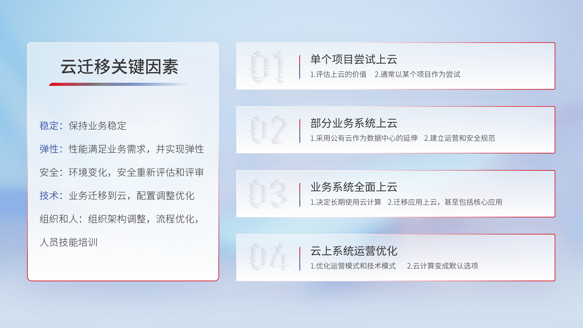 结合实际业务,,从规划设计、、、云平台选型、、、、云原生改造、、、、数据迁移、、、集成交付,,,,迁移全过程为客户识别最佳上云路径,,,做好风险识别管理,,,设计网络架构、、身份权限、、、、安全审计合规、、、操作审计、、日志审计、、、监控告警策略、、多站点容灾设计等,,对云上基础设施进行整体规划,,提升IT治理水平,,,,以满足弹性、、、高可用、、、高性能的需求。。